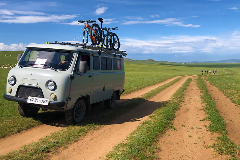 We start cycling across vast open grassland alternated by rolling hills. We ride along distinct car tracks on predominantly packed surfaces. Along the way, you will see herds of cattle, sheep, and goats. With over 70 million livestock, animal herding remains the backbone of Mongolia’s rural economy. Certainly, we will encounter Mongolian horses that hold an important place in the nomadic culture and a dependable companion of Mongol men.
